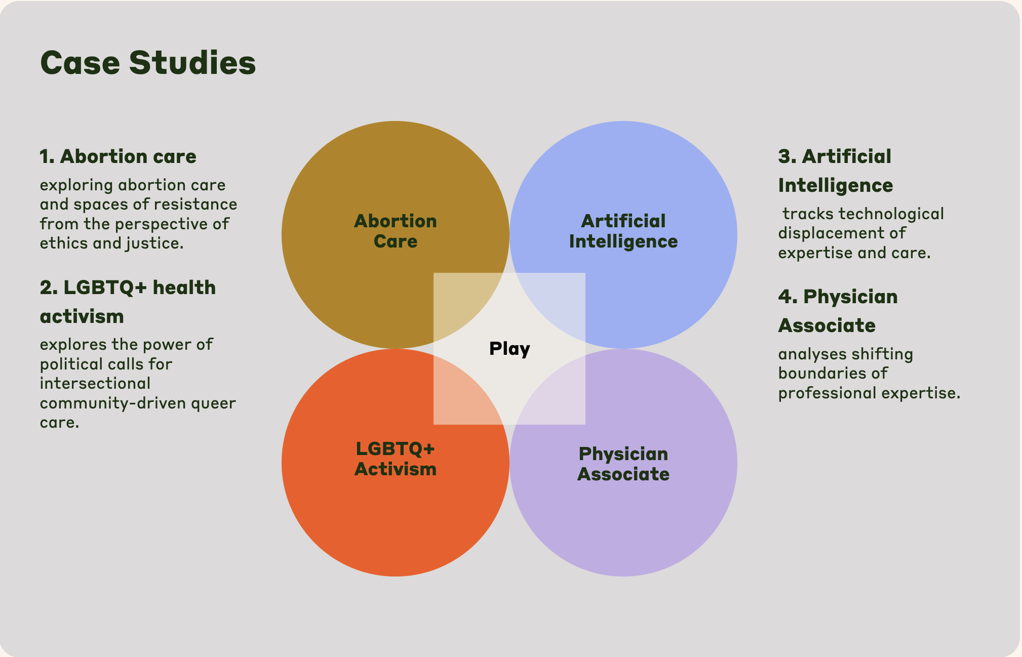 We study the ongoing disruption and transformation of medicine with four case studies: Abortion care, LGBTQ+ health activism, Artificial Intelligence and Physician Associate. We ask in each of these cases how medicine without doctors might be imagined, and what such vision would enable or undermine. Across these areas, we study how medical authority is reshaped, how our understanding of care changes, and whose voices come to matter. Our collaborative work in the project is anchored within the thematic concepts of care and voice, and by methodological commitment to play.